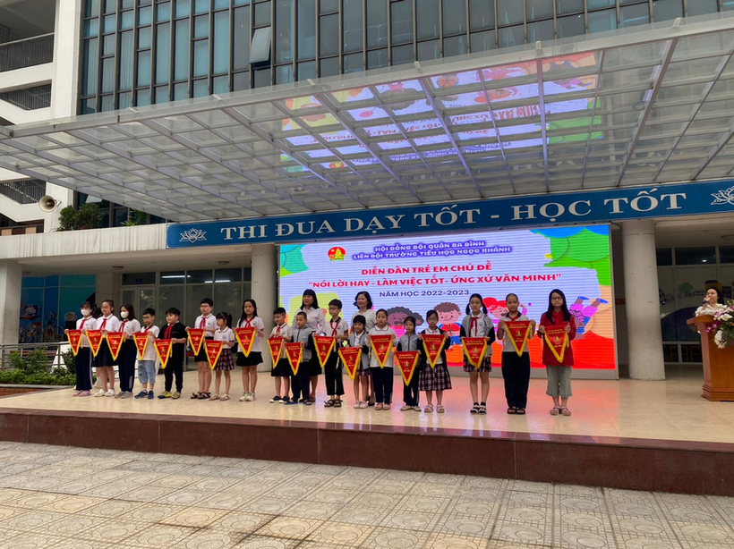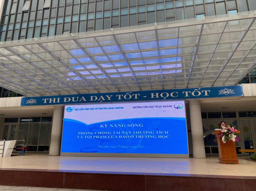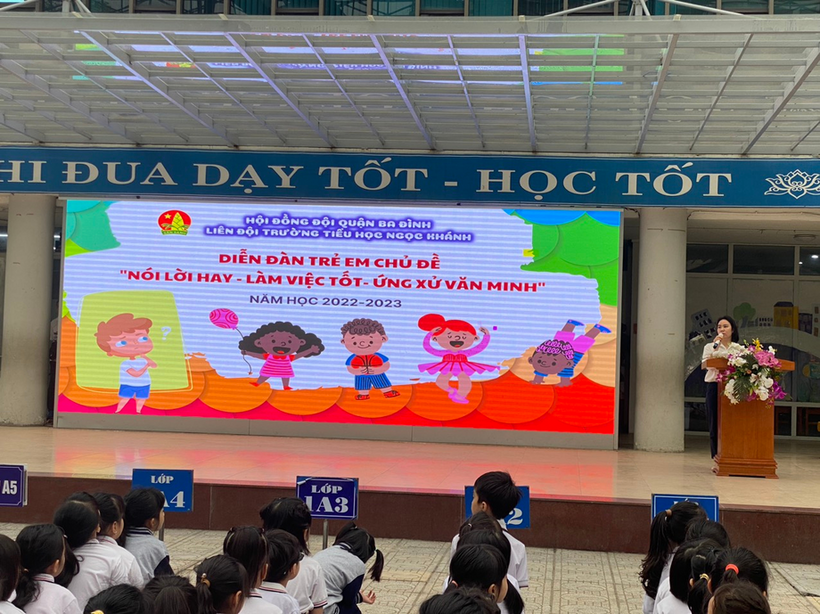 Sau màn Chào cờ đầu tuần, lắng nghe bạn Đội trưởng đội Sao đỏ tổng kết thi đua tuần vừa qua, chúng tớ được cô Tổng phụ trách thông báo kết quả học sinh tham gia kì thi vẽ cấp Quận, vinh danh những bạn xuất sắc đạt giải; được cô phát động: Diễn đàn trẻ em chủ đề: “Nói lời hay – Làm việc tốt - Ứng xử văn minh” do Hội đồng đội Quận Ba Đình kết hợp với Liên đội Trường Tiểu học Ngọc Khánh tổ chức. Đặc biệt, chúng tớ còn được lắng nghe chia sẻ của Cô Nguyễn Thanh Hiếu – Phó Giám đốc Trung tâm dân số Quận Ba Đình. Những câu hỏi giao lưu, những câu chuyện thực tế rút ra bài học xương máu để giúp chúng tớ hiểu thế nào là Tai nạn thương tích và Tội phạm lừa đảo ở Trường học để từ đó chúng tớ có những kĩ năng cần thiết để phòng tránh. Đây là Chương trình bổ ích và thiết thực cho học sinh chúng tớ do Nhà trường phối hợp với Hội liên hiệp Phụ nữ phường Ngọc Khánh tổ chức buổi giao lưu này. Hoạt động trải nghiệm nhằm giúp chúng tớ có được kì nghỉ hè, nghỉ lễ sắp tới “An toàn – vui vẻ” trọn vẹn!