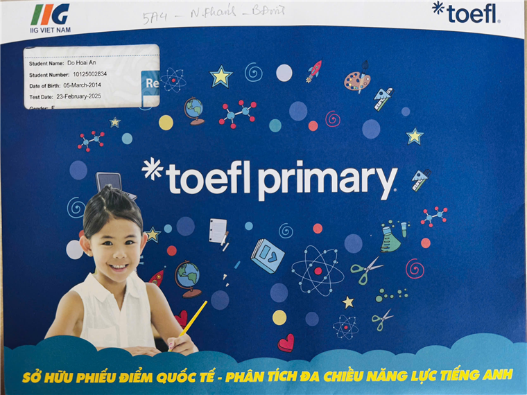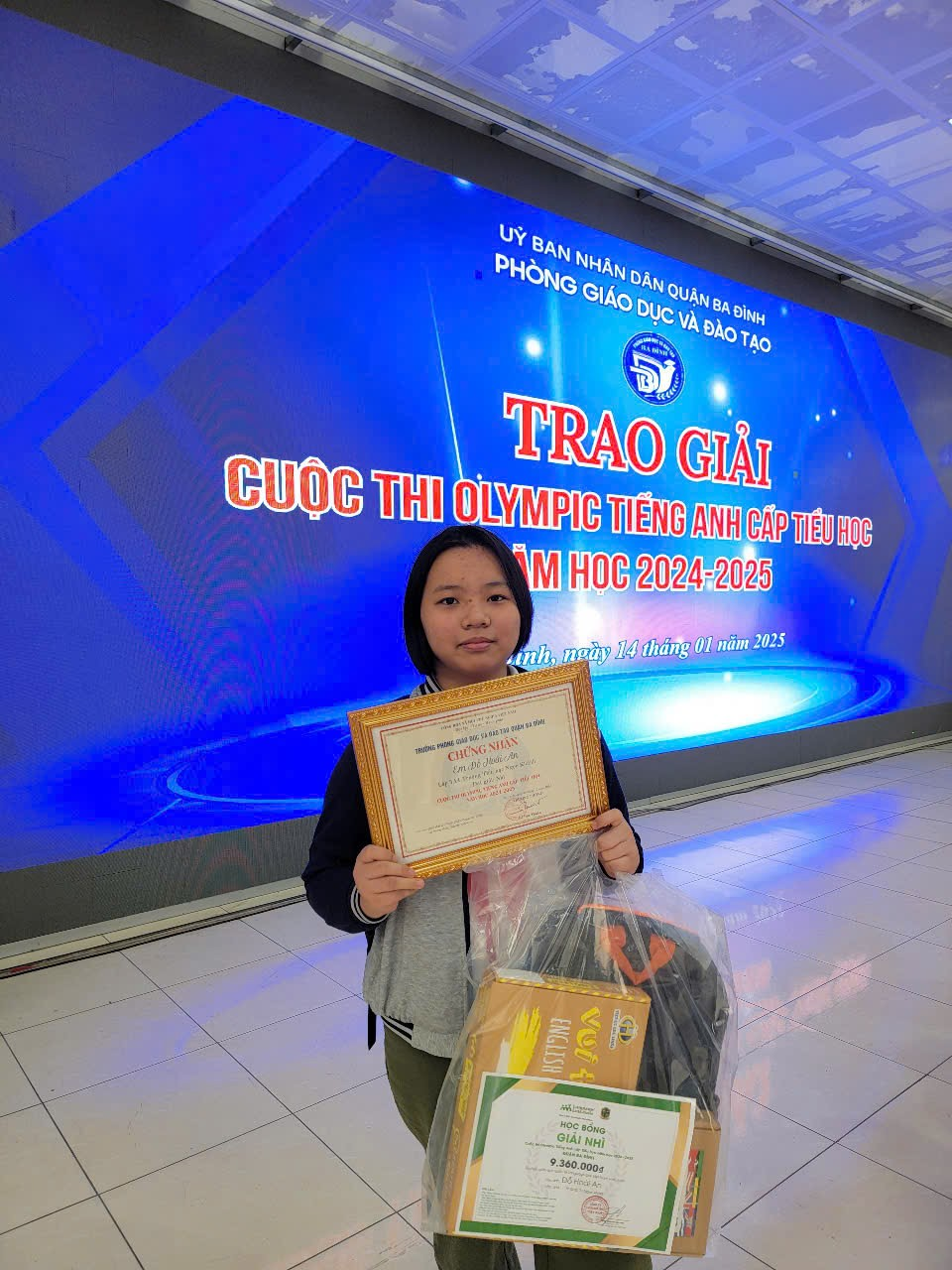 Hoài An luôn say mê học tập các môn và đặc biệt với môn Tiếng Anh. Khả năng nghe nói đọc viết – bốn kĩ năng cần có của môn Tiếng Anh em đều đạt mức xuất sắc. Chính vì vậy mà em đã giành được rất nhiều giải thưởng với môn Tiếng Anh này. Và vui mừng hơn hết chính là giải thưởng em vừa nhận được - giải Khuyến khích cấp Thành Phố môn Tiếng Anh năm học 2024-2025. Em đã mang về niềm tự hào cho ngành giáo dục Ba Đình, nhà trường và cũng như lớp 5A4 nói riêng.