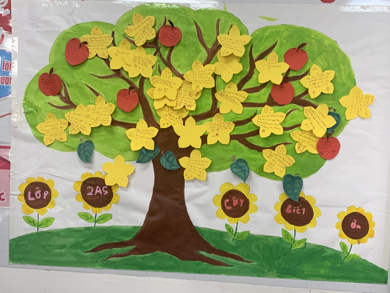 Điều đặc biệt nhất của tiết học là hoạt động “Cây yêu thương”. Mỗi bạn nhỏ được viết lời cảm ơn và yêu thương của mình lên những bông hoa và quả ngọt, rồi tự tay gắn lên cây như một cách thể hiện tấm lòng biết ơn. Khi “cây yêu thương” được phủ đầy sắc màu, cả lớp như bừng sáng bởi niềm vui, sự xúc động và tình cảm chân thành. Tiết học đã giúp các con học được cách nói lời yêu thương, biết trân trọng những người luôn quan tâm, chăm sóc mình hằng ngày.