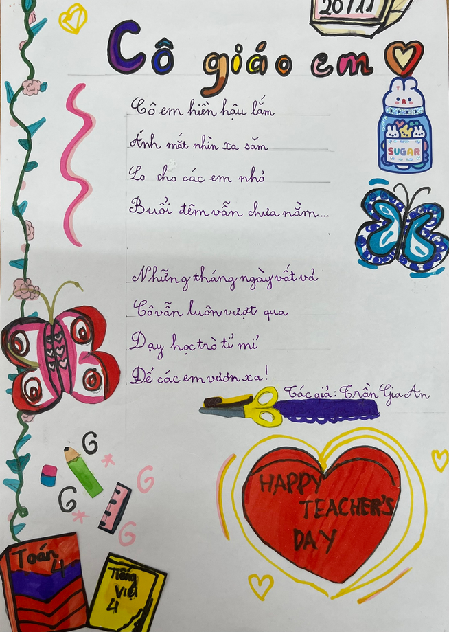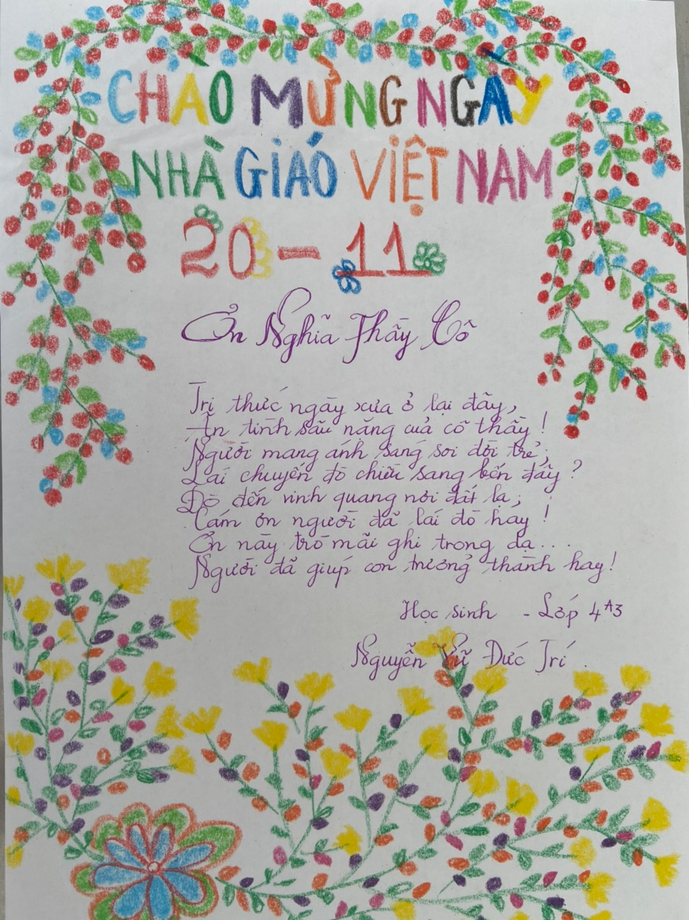 Qua hoạt động này, các em phát huy năng khiếu viết, vẽ, được học hỏi nhiều điều, hiểu biết thêm về những bài thơ, ca dao, tục ngữ, truyện... mà mình sưu tầm được. Mỗi nét vẽ đều chứa đựng tình cảm của các họa sĩ nhí thể hiện tình cảm với những người đã luôn tận tình truyền đạt kiến thức, chắp cánh dìu dắt mình lớn lên và đó cũng là thời gian để suy ngẫm, để nhớ về những kỉ niệm với thầy cô đáng kính, là những hình ảnh thân thương, không thể nào quên.