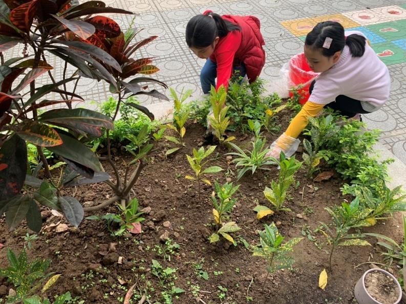 Các bạn nhỏ xung phong nhận các công việc như: tưới cây, nhổ cỏ, nhặt lá, nhặt rác ở các bồn cây, gốc cây, nhờ vậy mà bồn cây luôn xanh tốt.