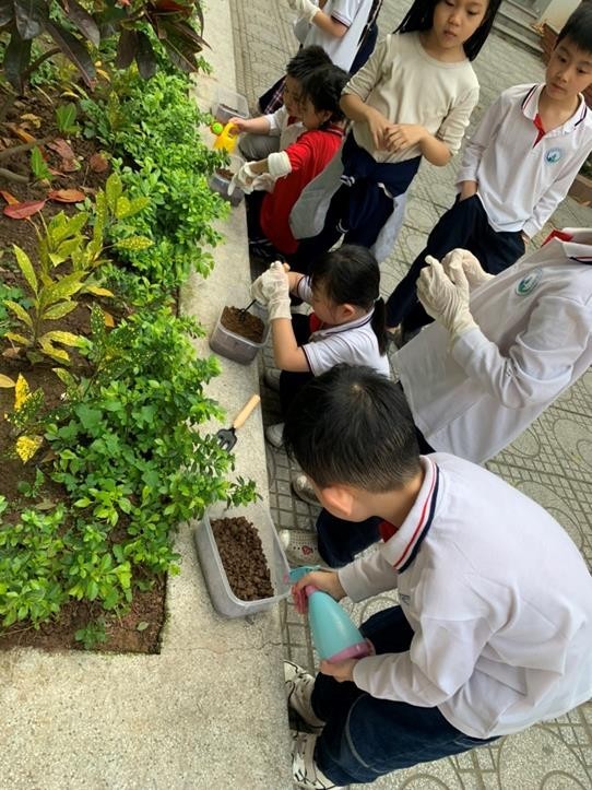 Các bạn HS lớp 1A5 đang chăm sóc bồn cây trước cửa lớp