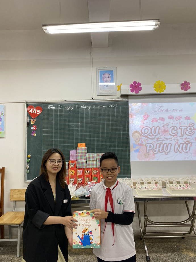 Chiều ngày 8/3, cô giáo và Phụ huynh học sinh lớp 4A5 cũng tổ chức hoạt động tặng quà cho các bạn nữ và tham gia các trò chơi vô cùng hào hứng. Hoạt động ý nghĩa này còn để lại trong long các con và trên gương mặt các em sự hân hoan. Mỗi bạn cũng đã tự hoàn thành bưu thiếp và gửi tặng mẹ, bà những lời chúc tốt đẹp nhất.