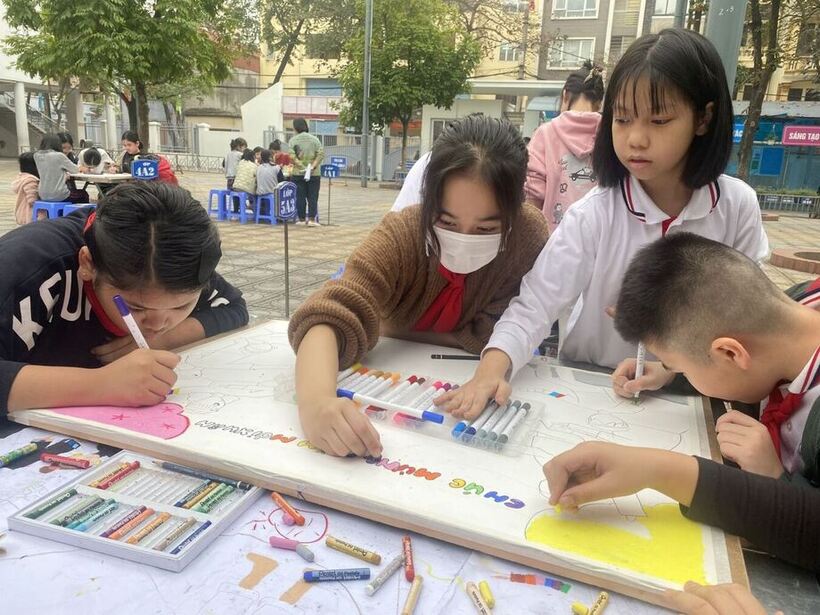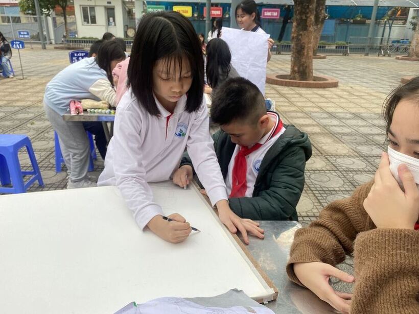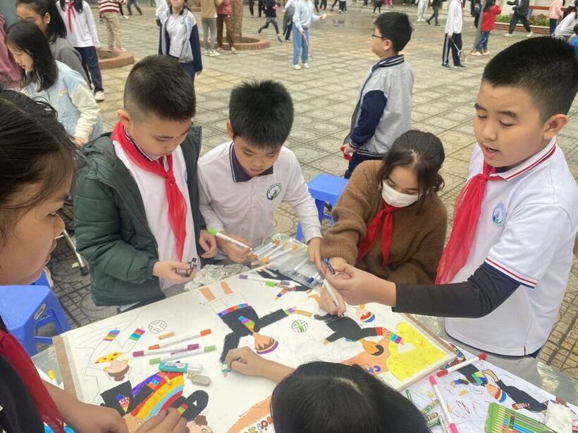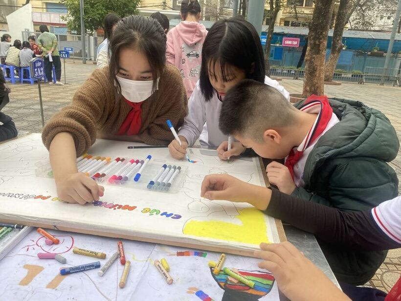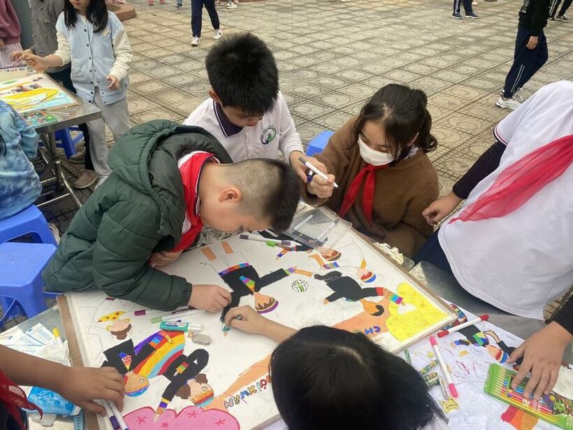 Chúng em chọn vẽ chủ đề: Hoạt động “ném pao” ngày Tết của dân tộc H’mông. Với chủ đề, chúng em muốn truyền tải thong điệp rằng: Tết là một ngày lễ quan trọng của nước Việt Nam ta, Tết ở khắp mọi nơi. Mỗi dân tộc ta sẽ đón Tết bằng những phong tục riêng, hoạt động khác nhau. Mỗi bạn phụ trách một mảnh của bức tranh, luân phiên hỗ trợ và giúp đỡ nhau để hoàn thành bức tranh được tốt nhất có thể. Em hi vọng, lớp 5A4 sẽ được giải nhất!