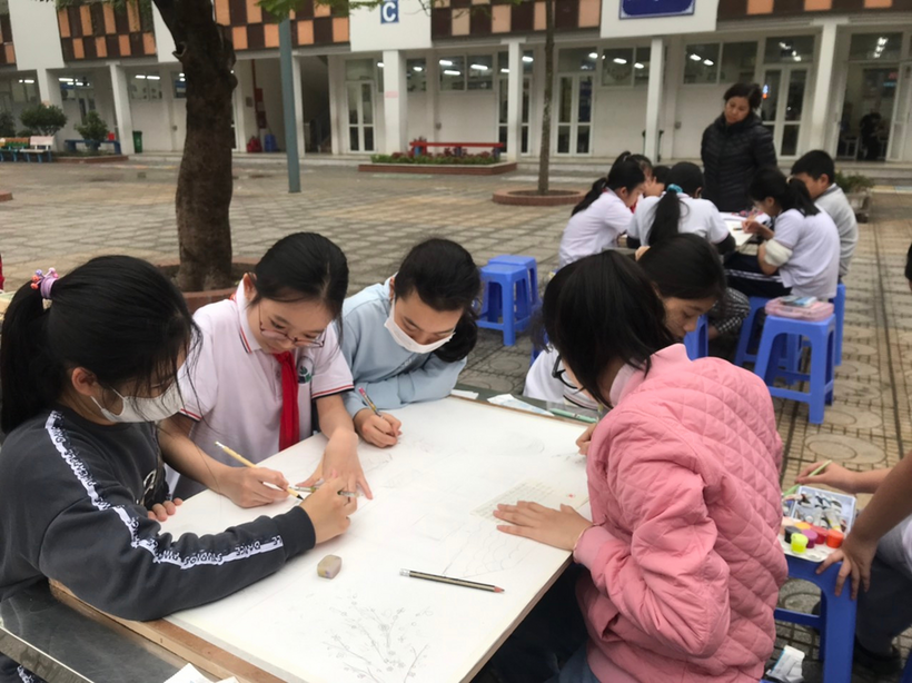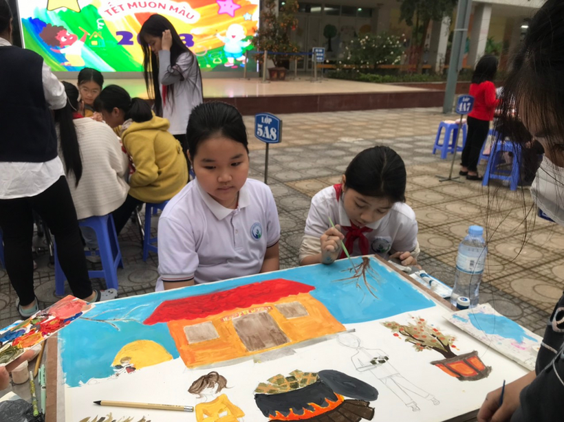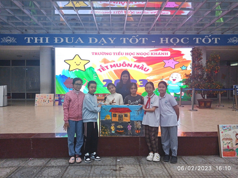 Đúng 14 giờ chiều ngày 6 tháng 2 năm 2023, các bạn đã bắt tay hoàn thành “tác phẩm dự thi” cho lớp. Trên khổ giấy A0, bằng chất liệu màu nước, những nét vẽ hồn nhiên đã hiện ra. Đó là ngôi nhà xinh xắn với mái ngói đỏ tươi, với cành đào, cây quất rực rỡ,…. Trước sân, các bạn nhỏ đang quây quần bên nồi bánh chưng. Tất cả tạo nên một không khí ấm áp chào đón xuân sang: