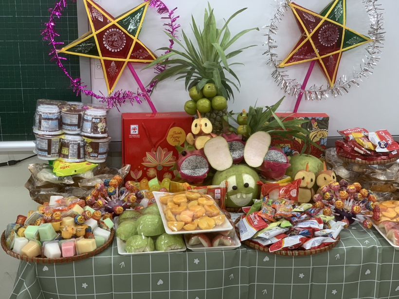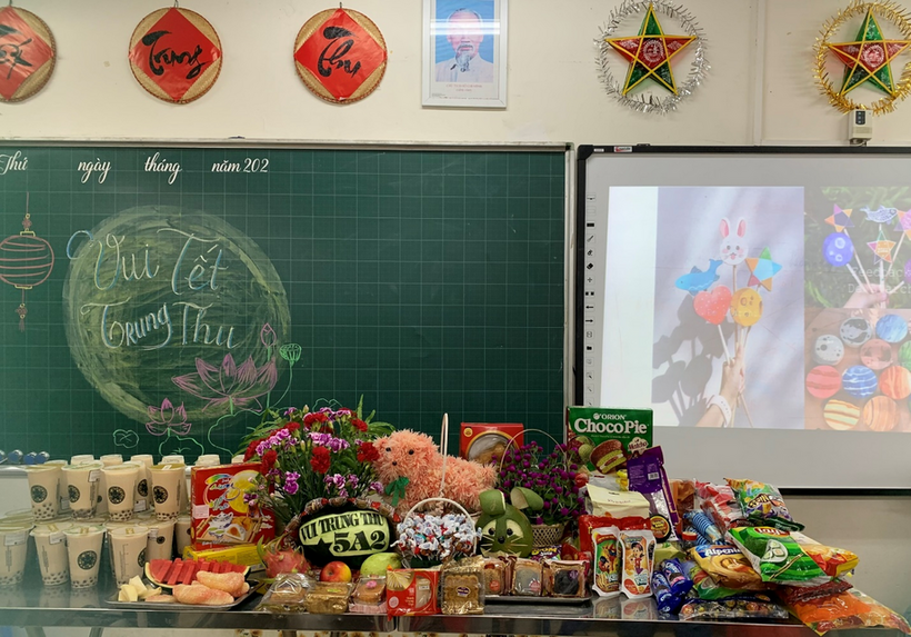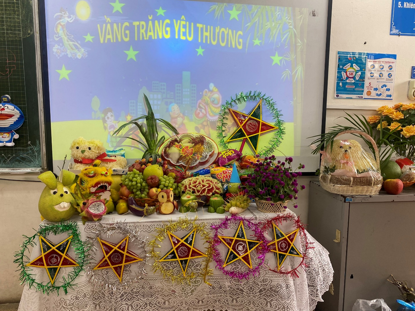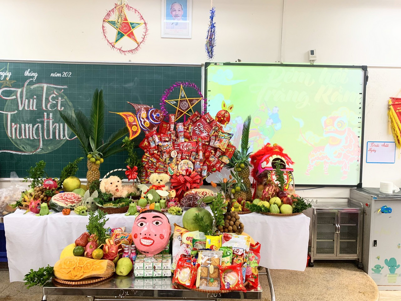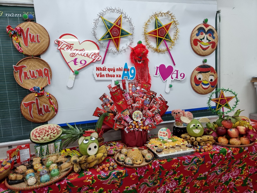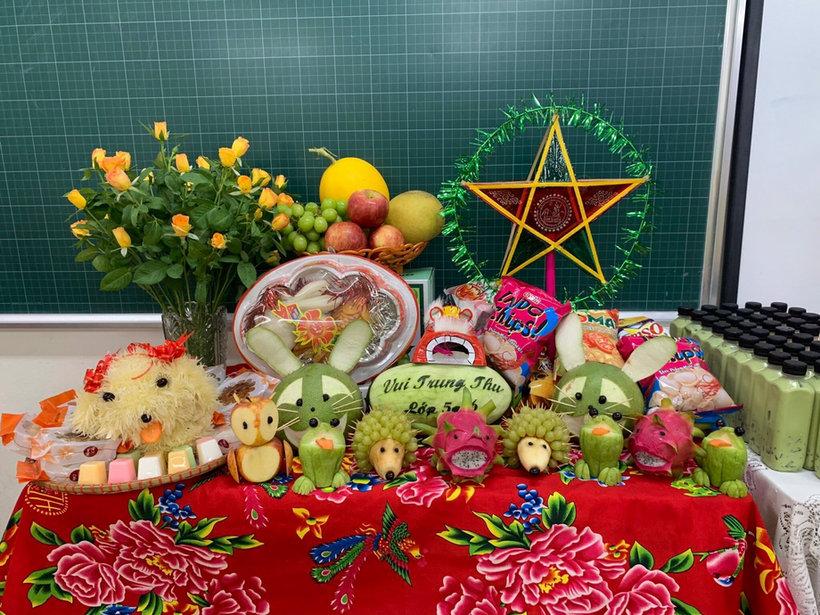 Các mâm cỗ trung thu do chính cô trò các lớp khối 5 tự tay bày