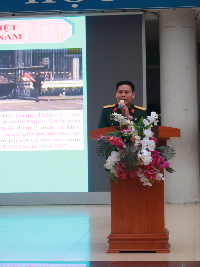 Để giúp các con thêm hiểu về trận chiến Hà Nôi – Điện Biên Phủ trên không, Thiếu tá Lê Văn Nam đã mang tới một bài thuyết trình với những hình ảnh hết sức chân thật cùng lời kể vô cùng sống động. Trận chiến Hà Nội – Điện Biên Phủ trên không sau 50 năm như được tái hiện lại một lần nữa. Các em học sinh vô cùng thích thú và chăm chú lắng nghe từng lời kể của Thiếu tá.