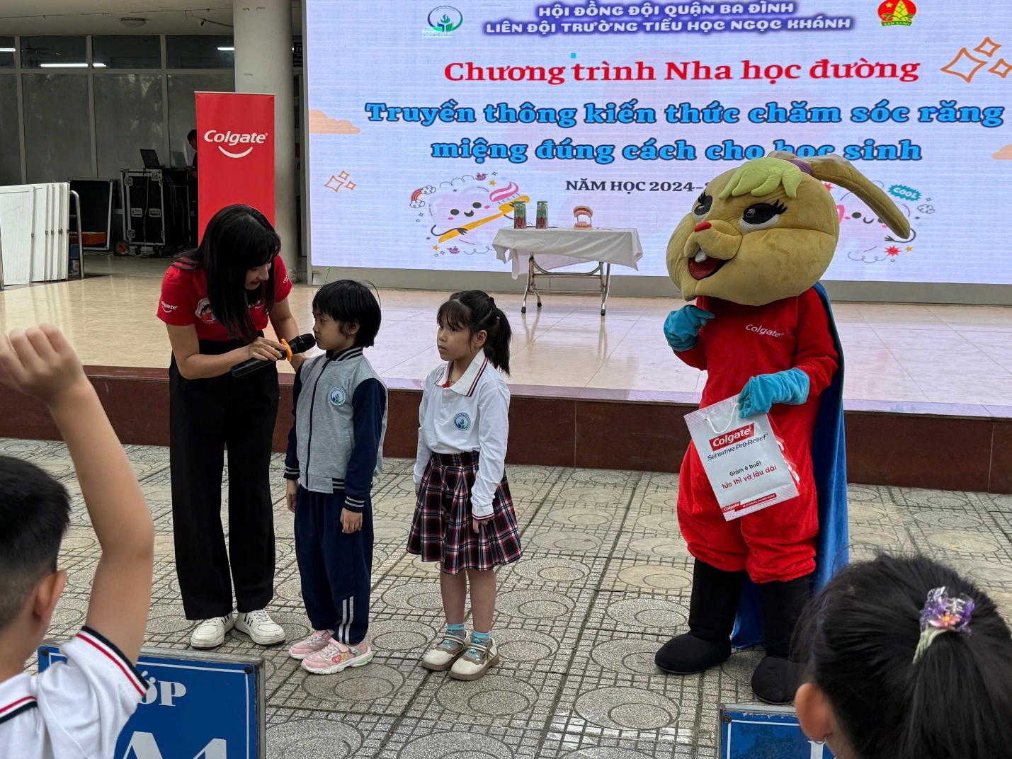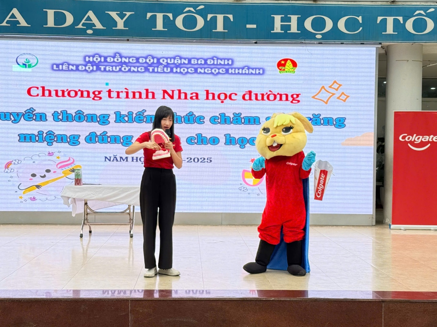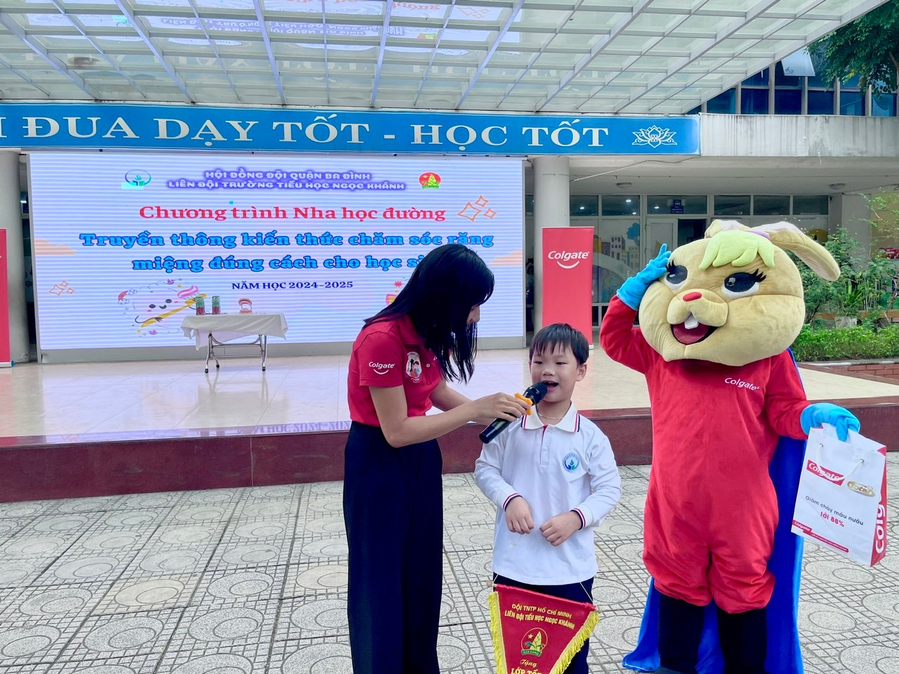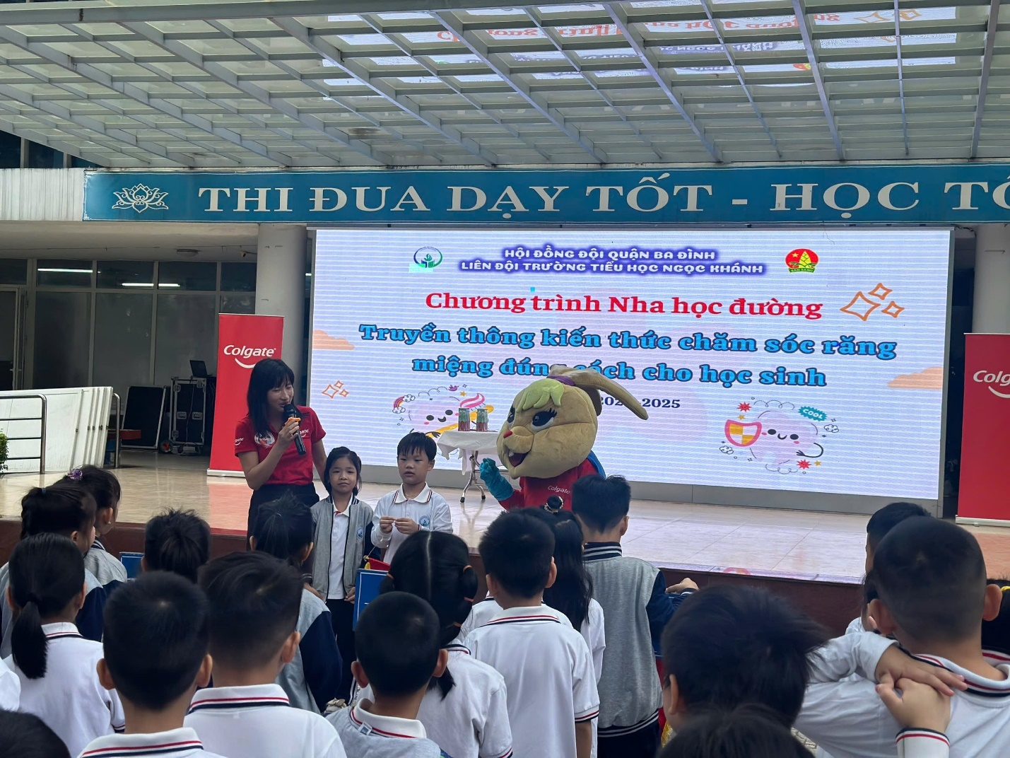 Theo khảo sát của Hội Răng hàm mặt Việt Nam cho thấy, có đến hơn 90% các em nhỏ nhất là học sinh ở độ tuổi tiểu học mắc các vấn đề về răng miệng như sâu răng, sún răng…phần lớn đến từ việc chăm sóc răng miệng chưa đúng cách. Đối với nhà trường, chương trình Nha học đường cùng với Colgate là một trong những chương trình có ý nghĩa đặc biệt nhằm giáo dục học sinh biết tự bảo vệ và chăm sóc răng miệng, nhằm hạn chế mắc các bệnh về lý về răng, mang lại nụ cười tươi sáng cho các bạn học sinh. Sau đây là một vài hình ảnh giao lưu giữa chuyên viên phụ trách Nha học đường, cùng với bác sĩ Thỏ và các bạn học sinh trường Tiểu học Ngọc Khánh:
