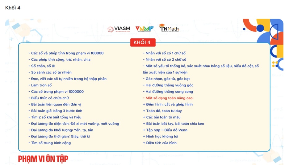 Phạm vi kiến thức không vượt quá chương trình học kỳ I của từng khối lớp. Bên cạnh đó, học sinh cần có các kỹ năng khác quan trọng trong toán học như: tư duy quy nạp, tư duy phản chứng, tư duy về cực hạn (giá trị lớn nhất, nhỏ nhất), tư duy liệt kê, phân hoạch,...