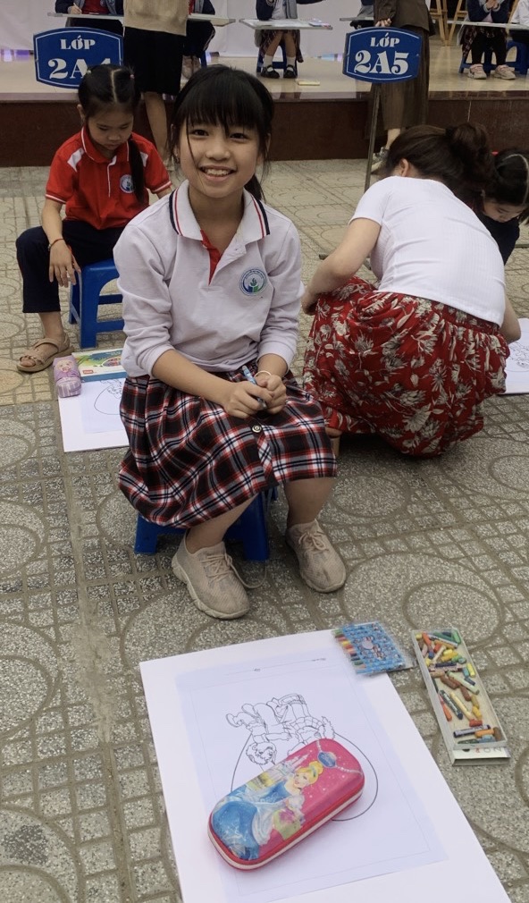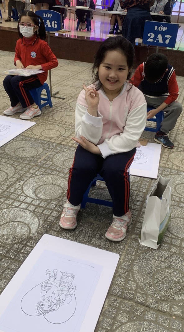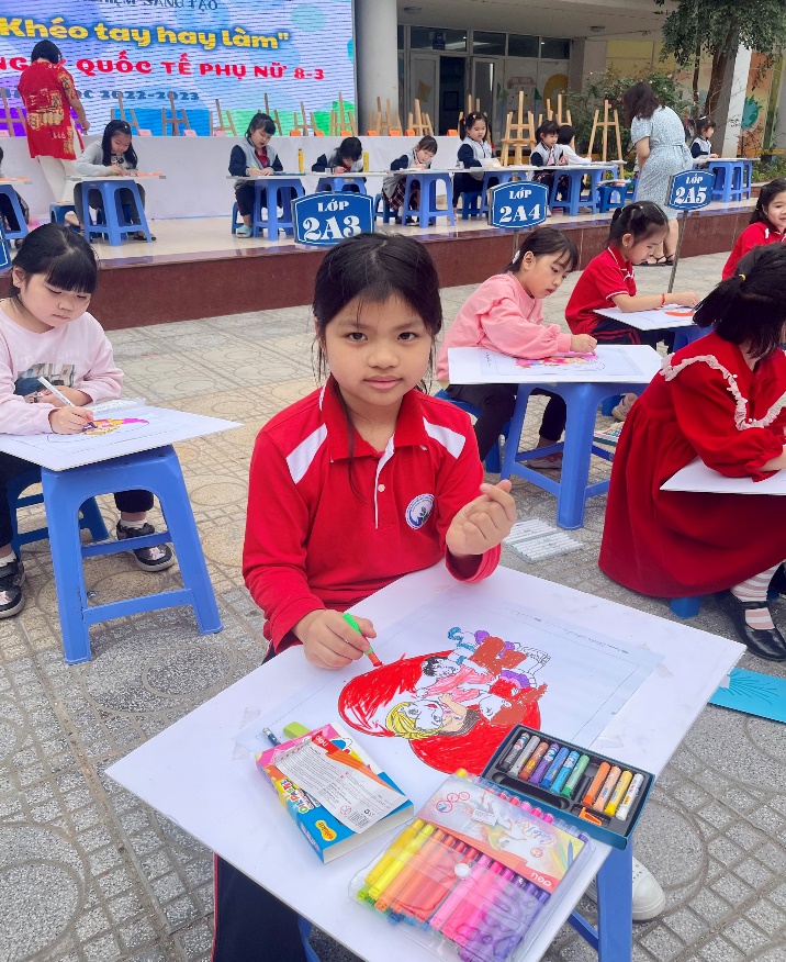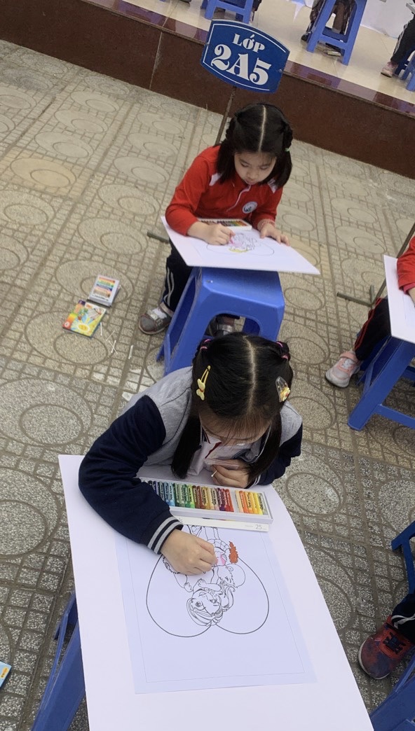 Các em học sinh Khối 1 và học sinh Khối 2 thi Tô màu tranh chủ đề 8/3