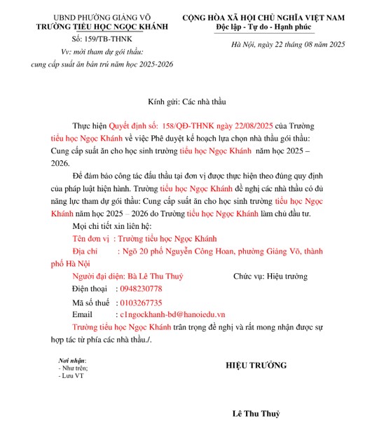 Thông báo mời tham dự lựa chọn nhà thầu gói thầu: cung cấp suất ăn bán trú cho học sinh trường tiểu học Ngọc Khánh năm học 2025 – 2026.