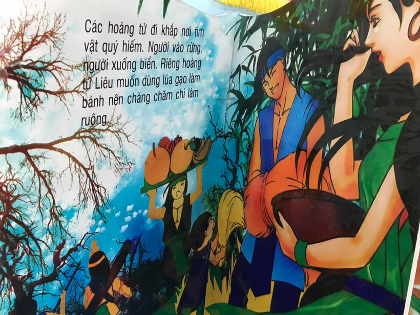Các hoàng tử đua nhau lên rừng xuống biển tìm của ngon vật lạ. Riêng hoàng tử Lang Liêu nghĩ mình sẽ dâng vua cha sản vật từ chính đồng quê của mình. Chàng cùng vợ con chăm sóc cho cánh đồng lúa quê hương. Lang Liêu chợt nghĩ: Không gì có thể thay thế được lúa gạo, Trời tròn, Đất vuông. Chàng cùng mọi người chuẩn bị lá dong, gạo nếp, đậu xanh, thịt lợn và gói thành một thứ bánh vuông, bọc lá xanh. Mọi người cùng nhau mang gạo nếp giã nhuyễn và nặn thành một thứ bánh mịn màng, cẩn thận cho từng cái bánh.