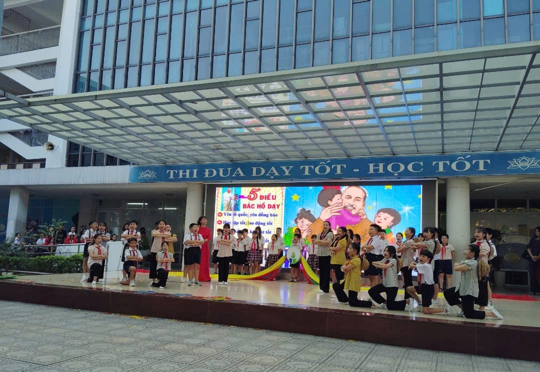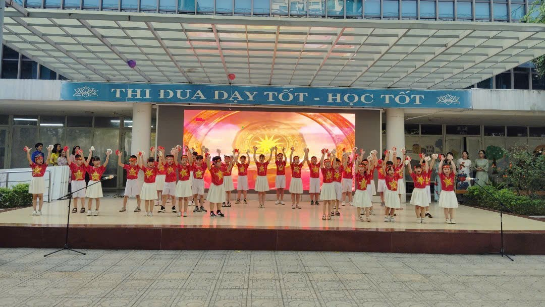 Mở đầu là ghi lễ chào cờ trang trọng và chương trình văn nghệ chào mừng rất sôi nổi từ các em thiếu nhi khối 2 và khối 5