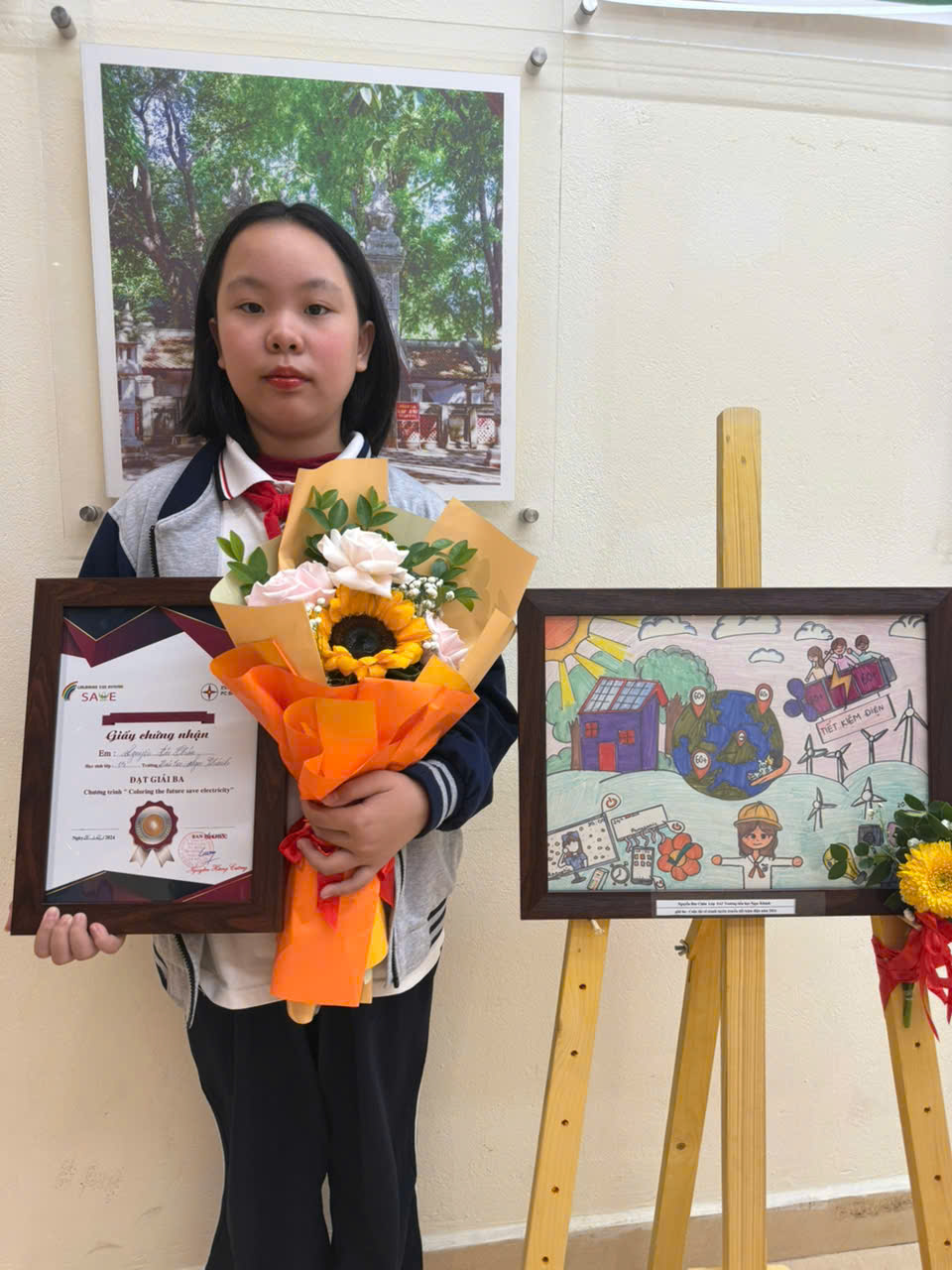 Học sinh Vũ Linh An, lớp 5A2 với tác phẩm đạt giải Khuyến khích.