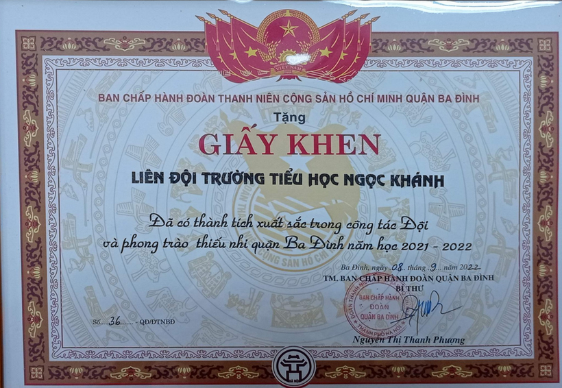 Tại Hội nghị tổng kết Công tác Đội và phong trào Thiếu nhi, Liên đội trường TH Ngọc Khánh đã vinh dự nhận được giấy khen của Ban chấp hành Đoàn TNCS Hồ Chí Minh quận Ba Đình với những thành tích xuất sắc trong công tác Đội và phong trào thiếu nhi năm học 2021-2022.