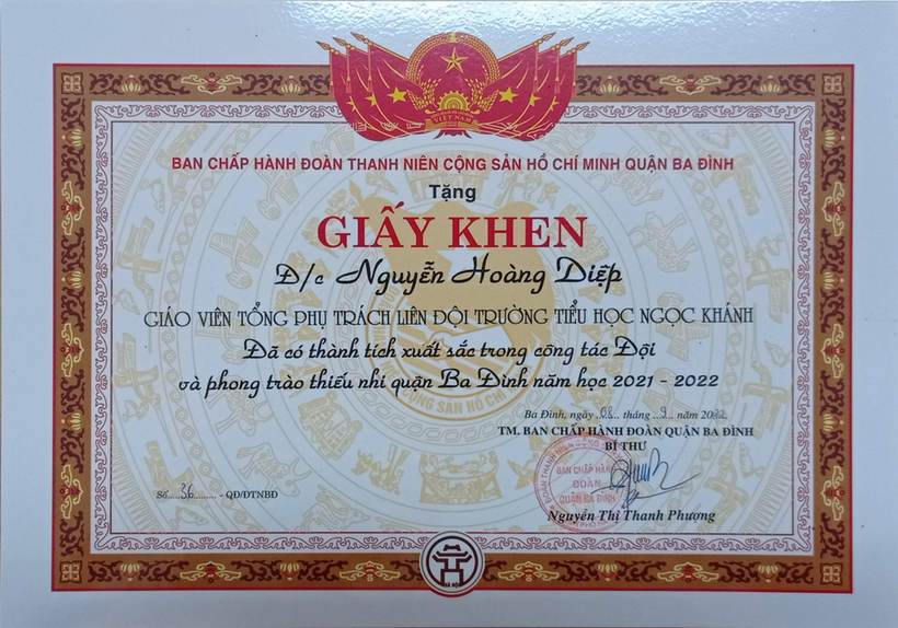 Cô giáo Nguyễn Hoàng Diệp- GV - Tổng phụ trách Đội cũng đã vinh dự nhận giấy khen của Quận đoàn Ba Đình: "Đã có thành tích xuất sắc trong công tác Đội và phong trào thiếu nhi năm học 2021 - 2022".