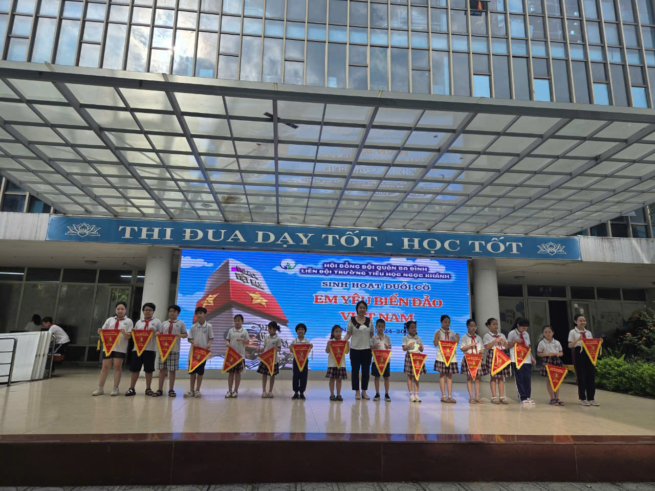 Phần nghi lễ chào cờ, hát Quốc ca, Đội ca diễn ra trong không khí trang trọng, cả trường đứng nghiêm, cùng hướng nhìn về lá cờ Tổ quốc đang tung bay trong gió. Sau phần nghi lễ là phần Sinh hoạt theo chủ điểm “Em yêu biển đảo Việt Nam”. Tiếp đến là phần nhận xét tuần 3 - tập thể lớp 3A2 đã rất vinh dự khi được khen về nề nếp ra vào, đi học…, được nhận cờ thi đua từ tay cô giáo Lê Thu Thuỷ – Bí thư chi bộ, Hiệu trưởng nhà trường trao cho với nhiều lời ngợi khen. Sau một tuần với sự cố gắng của cả tập thể lớp, nhận trên tay cờ thi đua, các bạn học sinh chắc hẳn vô cùng tự hào.