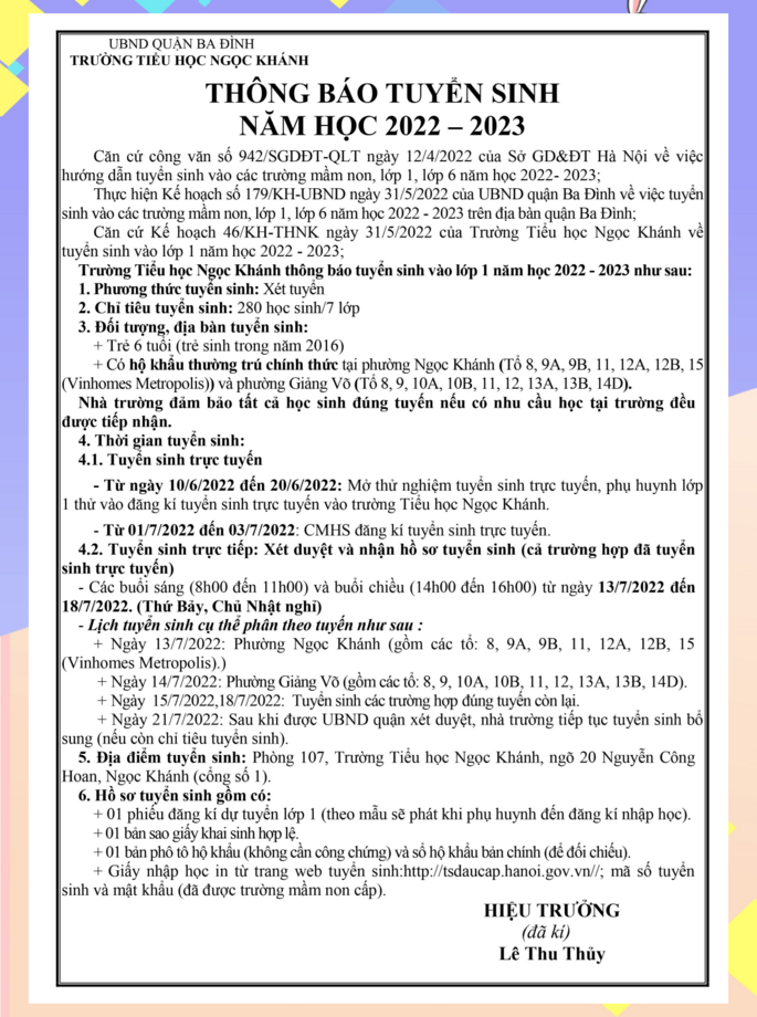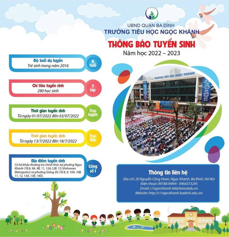 Trường Tiểu học Ngọc Khánh thông báo tuyển sinh lớp 1 năm học 2022-2023