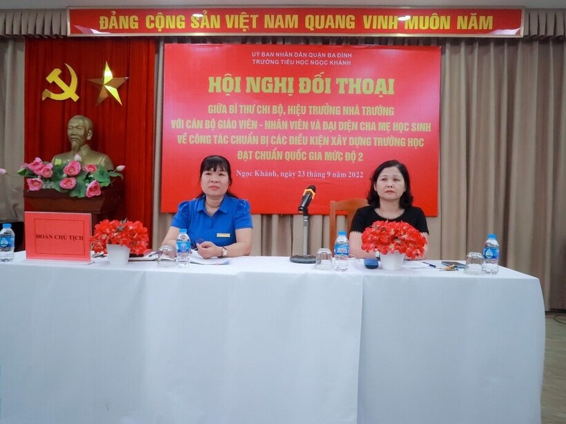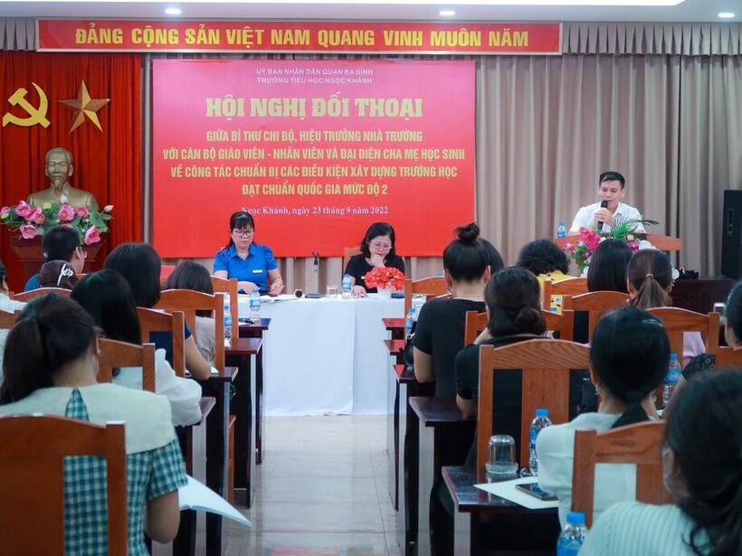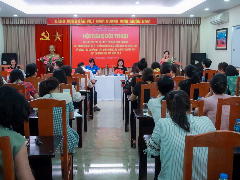 Thực hiện Quyết định số 2200-QĐ/TU ngày 25/5/2017 của Thành ủy Hà Nội về ban hành “Quy chế tiếp xúc, đối thoại trực tiếp giữa người đứng đầu cấp ủy, chính quyền các cấp với Mặt trận Tổ quốc, các tổ chức chính trị- xã hội và nhân dân trên địa bàn thành phố Hà Nội”, nhằm thực hiện, phát huy tính dân chủ, lắng nghe ý kiến, nắm bắt tâm tư, nguyện vọng của giáo viên, phụ huynh và học sinh để giúp nhà trường có những điều chỉnh các hoạt động kịp thời nhằm “chuẩn bị các điều kiện xây dựng trường học đạt chuẩn quốc gia mức độ 2; quản lí, phát huy cơ sở vật chất của nhà trường nhằm nâng cao chất lượng dạy và học”, chiều ngày 23/9/2022, trường Tiểu học Ngọc Khánh đã trang trọng tổ chức Hội nghị Đối thoại giữa Bí thư Chi bộ, Hiệu trưởng nhà trường với tập thể cán bộ giáo viên nhân viên và phụ huynh của trường.
