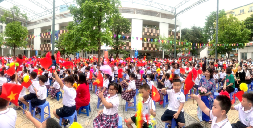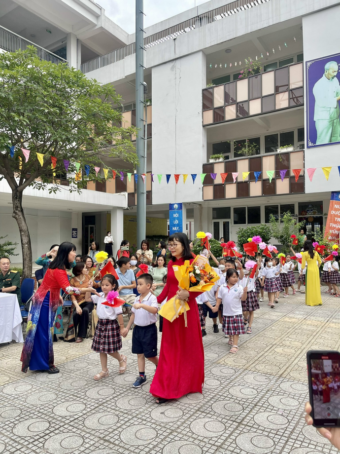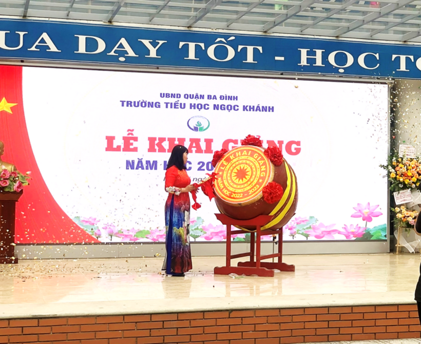 Lễ khai giảng bắt đầu lúc 7h30', với các nghi thức chào đón đại biểu, chào cờ, hát Quốc ca, Đội ca. Sau bài đọc thư của Chủ tịch nước, cô Hiệu trưởng Lê Thu Thủy tuyên bố khai giảng năm học mới và đánh trống khai trường.