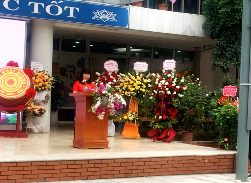 Cô Hiệu trưởng Lê Thu Thủy đọc bài diễn văn tuyên bố khai giảng năm học mới.