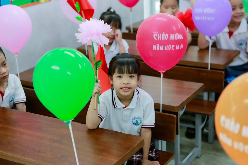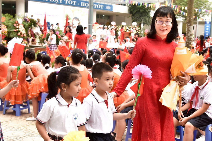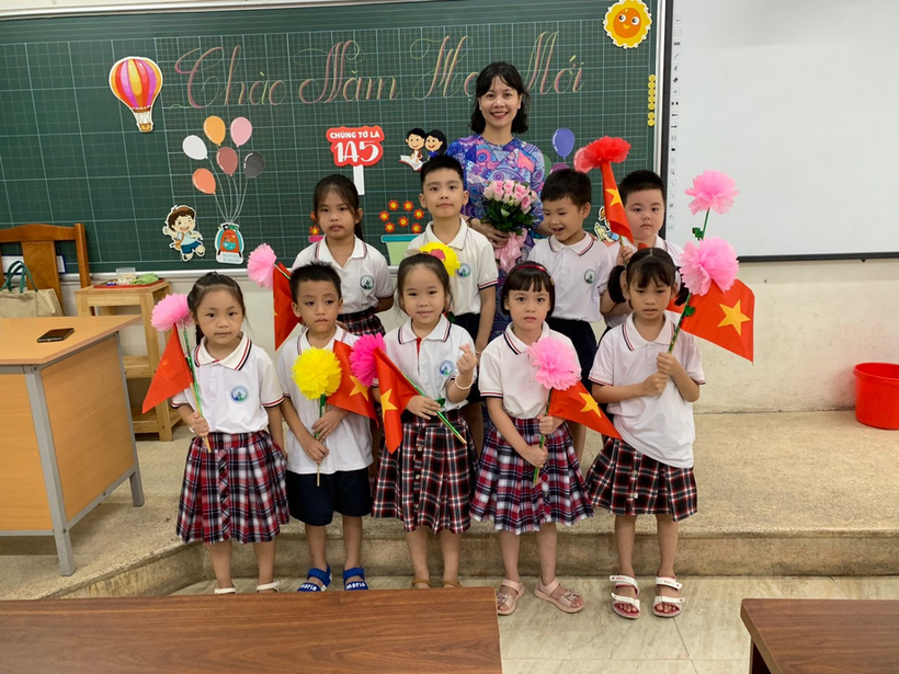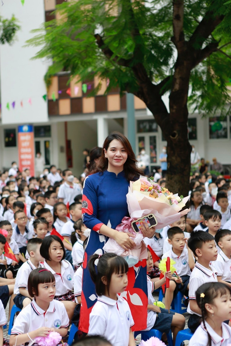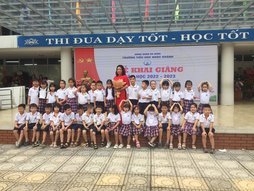 Hình ảnh cô và trò học sinh lớp 1 trường Tiểu học Ngọc Khánh rộn ràng trong ngày khai trường đầu tiên.