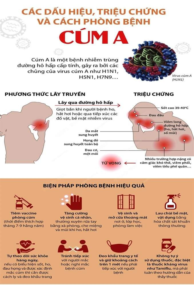 Bệnh cúm A là bệnh truyền nhiễm cấp tính với biểu hiện sốt, đau đầu, đau cơ, mệt mỏi, sổ mũi, đau họng và ho. Tác nhân gây bệnh chủ yếu do các chủng vi rút cúm A (H3N2), cúm A (H1N1), cúm B và cúm C. Bệnh có khả năng lây nhiễm rất cao, bệnh lây truyền từ người sang người theo đường hô hấp, qua các giọt nước bọt hay dịch tiết mũi họng khi người bệnh ho, hắt hơi, hoặc lây qua tiếp xúc với một số đồ vật có chứa vi rút rồi qua bàn tay đưa lên mắt, mũi, miệng. Người mang vi rút cúm có khả năng truyền vi rút cho những người xung quanh trong thời gian 1 ngày trước tới 7 ngày sau, kể từ khi có triệu chứng của bệnh. Bệnh lây lan càng mạnh, càng nhanh khi có sự tiếp xúc trực tiếp với người bệnh, đặc biệt ở nơi tập trung đông người như trường học, nhà trẻ...
