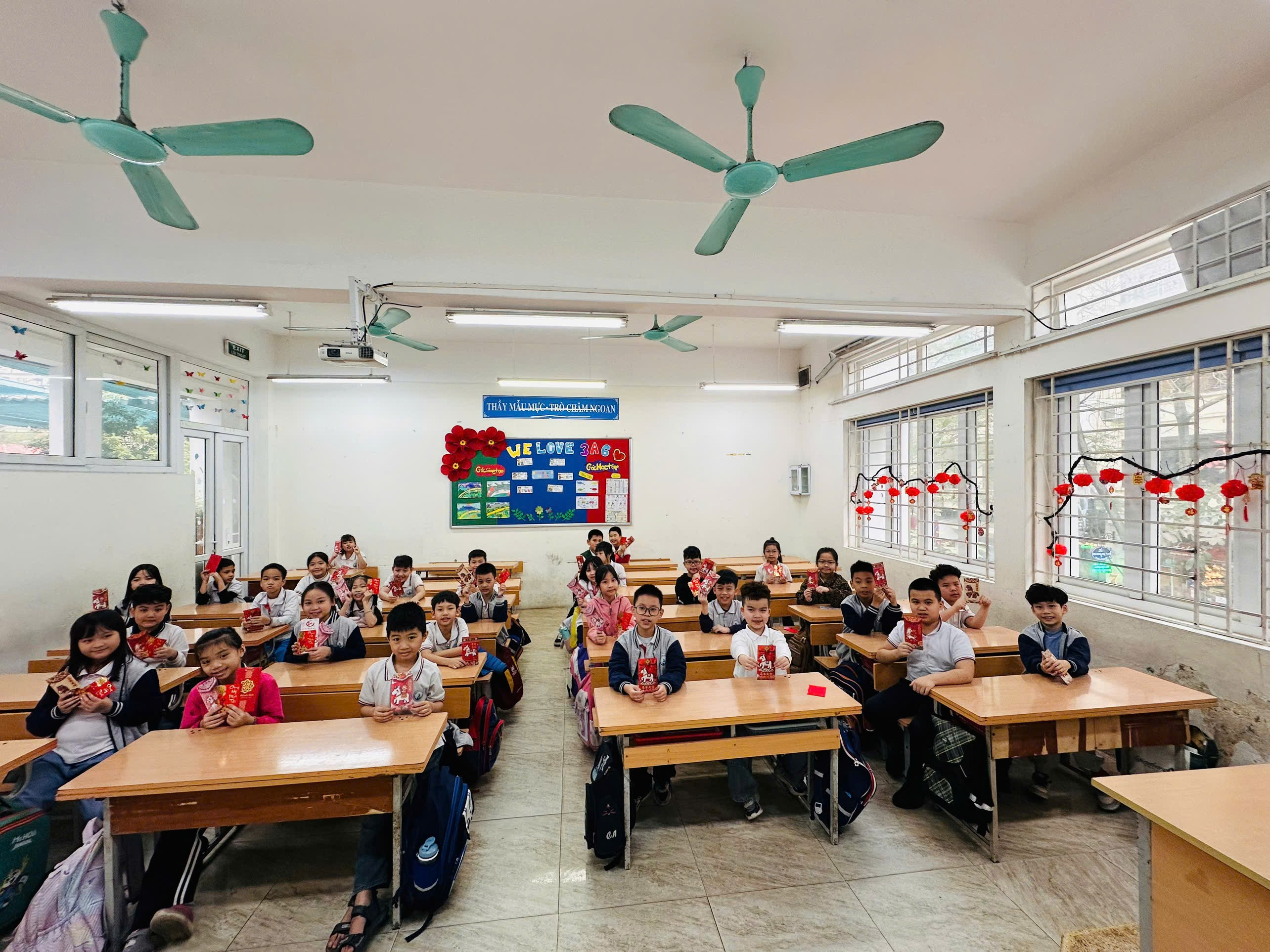 Tại lớp học, cô giáo chủ nhiệm đã gửi tới các em học sinh những lời chúc năm mới ấm áp và trao những phong bao lì xì may mắn. Không khí lớp học ngập tràn tiếng cười, niềm vui và sự háo hức.