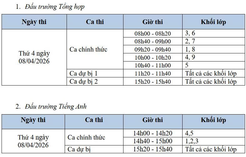 Lưu ý: Ca dự bị được tổ chức cho những học sinh gặp sự cố khách quan (thiết bị, đường truyền) trong các ca thi chính thức. Các trường hợp này phải có biên bản xác nhận của Giám thị và được BTC đồng ý cho phép thi lại.